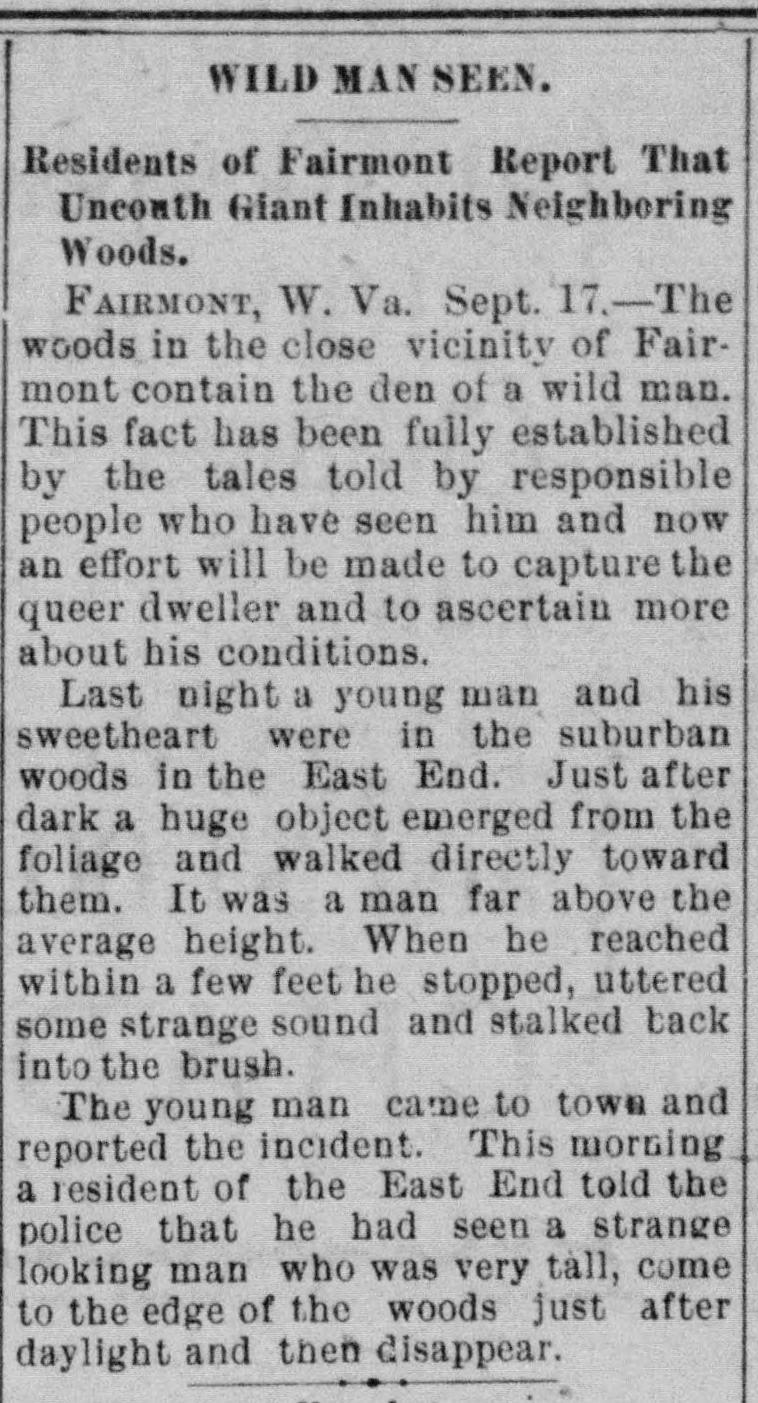 Fairmont, W. Va. Sept. 17. – The woods in the close vicinity of Fairmont contain the den of a wild man. This fact has been fully established by the tales told by responsible people who have seen him and now an effort will be made to capture the queer dweller and to ascertain more about his conditions.