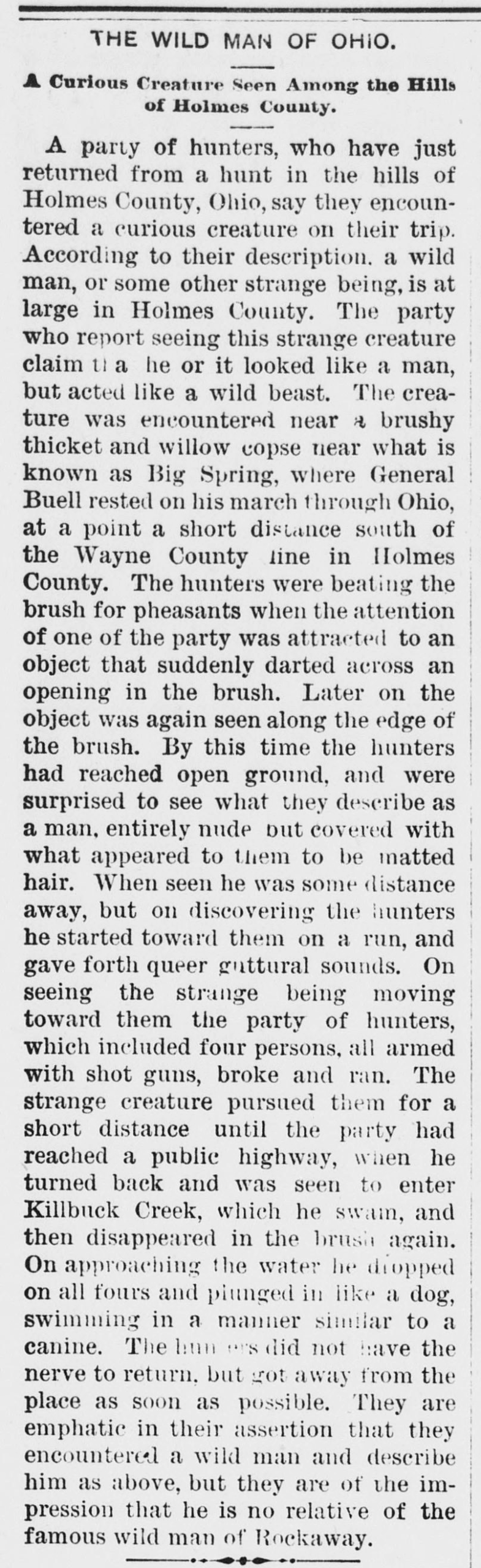 On seeing the strange being moving toward them the party of hunters, which included four persons, all armed with shot guns, broke and ran. The strange creature pursued them for a short distance until the party had reached a public highway, when he turned back and was seen to enter Killbuck Creek, which he swam, and then disappeared in the brush again. On approaching the water he dropped on all fours and plunged in like a dog, swimming in a manner similar to a canine. The hunters did not have the nerve to return, but got away from the place as soon as possible. They are emphatic in their assertion that they encountered a wild man and describe him as above, but they are of the impression that he is no relative of the famous wild man of Rockaway.